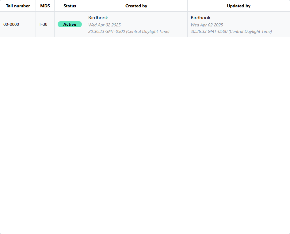 The MDS - Tail number relationship must be unique within the system. This means, by the shown example, that only one T-38 with tail number 00-0000 may exist. If, for some reason you receive an error that the tail number is unable to be created, please ensure you have properly input the tail number. Otherwise it may have already been created by another organization, or may reside within "The Boneyard". Please email support.birdbook@tfinnovations.com if you need asssistance.