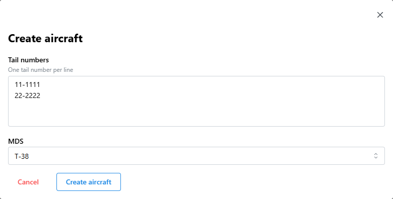 To create additional aircraft, click the Create aircraft button below the aircraft table. This will open the Create aircraft dialog window which will allow the administrator to add multiple tails to their organization.