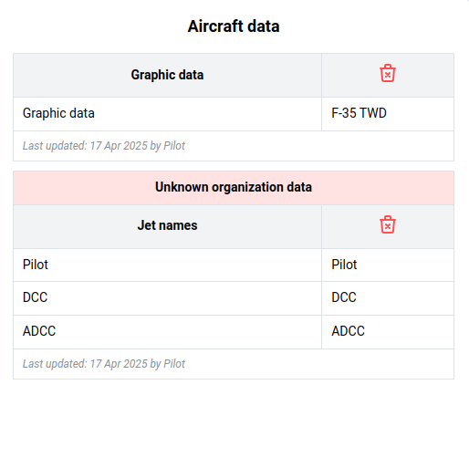 If attributes are associated with the aircraft that does not match any current organizational aircraft attribute, a red banner stating Unknown organization data will be displayed.
