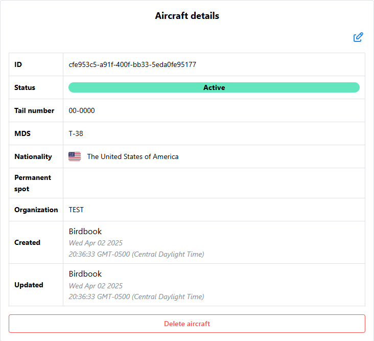 When aircraft are deleted, they remain within the Birdbook system but are not assigned to any organization,