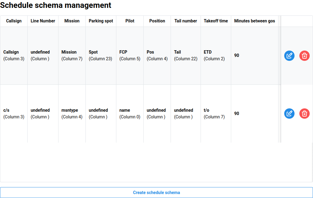 When importing a schedule for the first time, a schedule schema is created. This tells the system which columns contain the needed data to create the schedule. It also saves the text in the header of these columns in order to compare. This ensures that the correct schema is used.