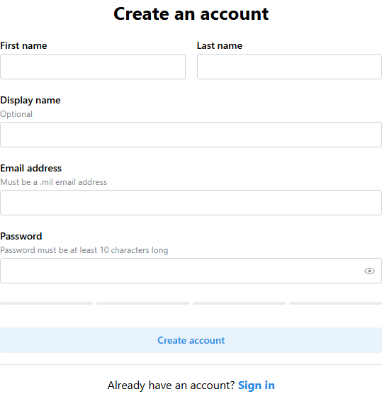 From the main sign-in page, click the Create an account button below the sign in form to navigate to the registration form.