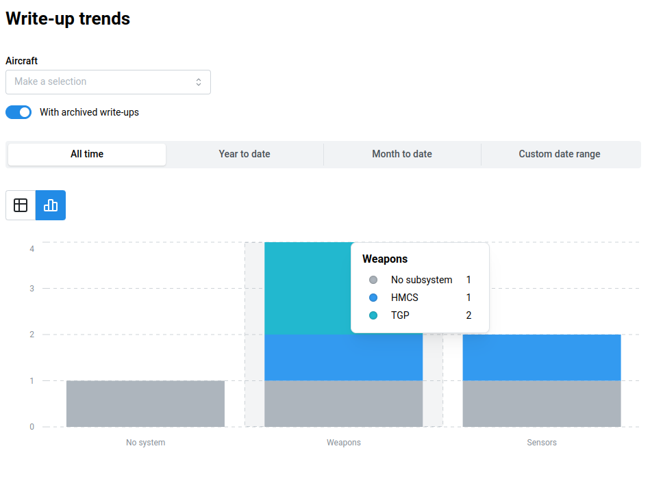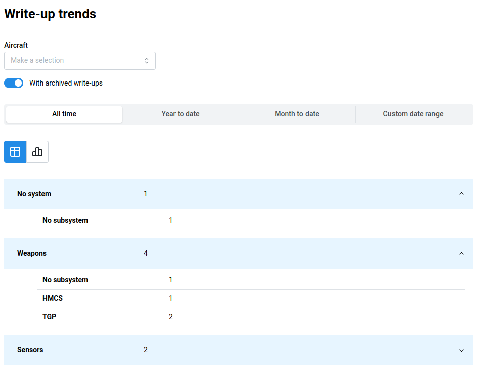 Clicking the system will expand the data associated with it, displaying the individual subsystems and the count of write-ups with the respective subsystem selected.