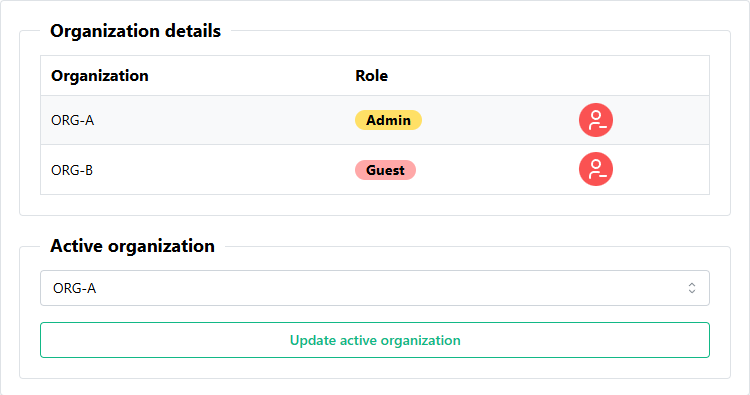 To change your active organization, if you are part of multiple organizations, select the organization from the dropdown menu and click the Update active organization button.